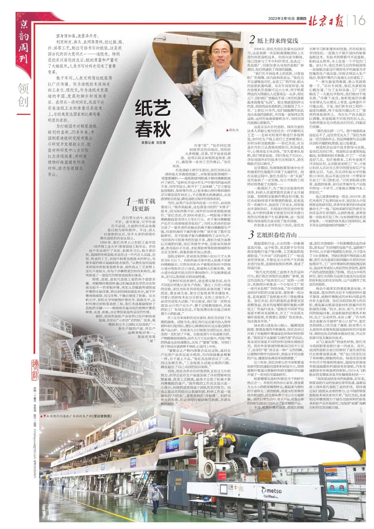 2023年3月16日,《北京日報(bào)》“京韻周刊·領(lǐng)創(chuàng)”專欄以《紙藝春秋》為題,刊發(fā)保利中輕所屬中國制漿造紙研究院研究開發(fā)部副主任、包裝研發(fā)中心主任張紅杰及其團(tuán)隊(duì),為打破國外對制漿造紙助劑的壟斷,持續(xù)研發(fā)植物纖維基綠色環(huán)保材料,助力繪就綠水青山的故事。與大家分享——