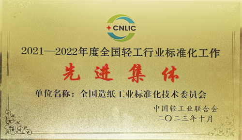 中國(guó)制漿造紙研究院榮獲“2021-2022年度全國(guó)輕工行業(yè)標(biāo)準(zhǔn)化工作先進(jìn)單位”稱號(hào);作為秘書處承擔(dān)單位運(yùn)營(yíng)的全國(guó)造紙工業(yè)標(biāo)準(zhǔn)化委員會(huì)榮獲“2021—2022年度全國(guó)輕工行業(yè)標(biāo)準(zhǔn)化工作先進(jìn)集體”稱號(hào)。