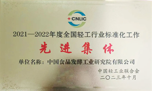 中國(guó)食品發(fā)酵工業(yè)研究院榮獲“2021-2022年度全國(guó)輕工行業(yè)標(biāo)準(zhǔn)化工作先進(jìn)集體”稱號(hào)。