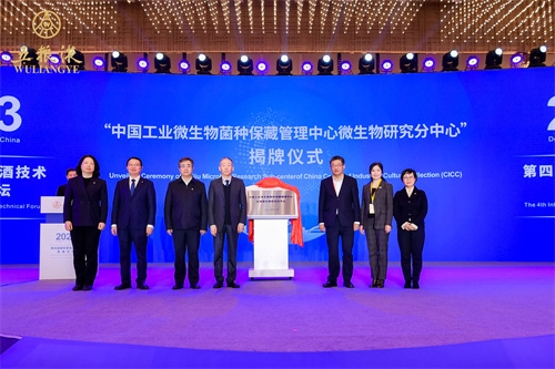 開(kāi)幕式上,中國(guó)食品發(fā)酵工業(yè)研究院與宜賓五糧液股份有限公司共建的“中國(guó)工業(yè)微生物菌種保藏管理中心白酒微生物研究分中心”揭牌儀式順利舉行,保利中輕副總經(jīng)理,中國(guó)食品發(fā)酵工業(yè)研究院黨委書(shū)記、董事長(zhǎng)肖丹與宜賓五糧液股份有限公司總工程師楊韻霞共同揭牌。安勝杰與中國(guó)酒業(yè)協(xié)會(huì)理事長(zhǎng)宋書(shū)玉,農(nóng)業(yè)農(nóng)村部中國(guó)農(nóng)村技術(shù)開(kāi)發(fā)中心副主任張松梅,五糧液集團(tuán)(股份)有限公司黨委書(shū)記、董事長(zhǎng)曾從欽,中國(guó)工程院院士、江南大學(xué)校長(zhǎng)陳衛(wèi)共同見(jiàn)證。“中國(guó)工業(yè)微生物菌種保藏管理中心白酒微生物研究分中心”是按照國(guó)家標(biāo)準(zhǔn)菌種資源庫(kù)組建的白酒行業(yè)最大的菌種保藏平臺(tái),該平臺(tái)現(xiàn)已收藏五糧液釀造微生物菌種400余種、1000余株、20000余份備份,為五糧液乃至中國(guó)白酒技術(shù)創(chuàng)新及生產(chǎn)應(yīng)用提供全面的菌種資源。