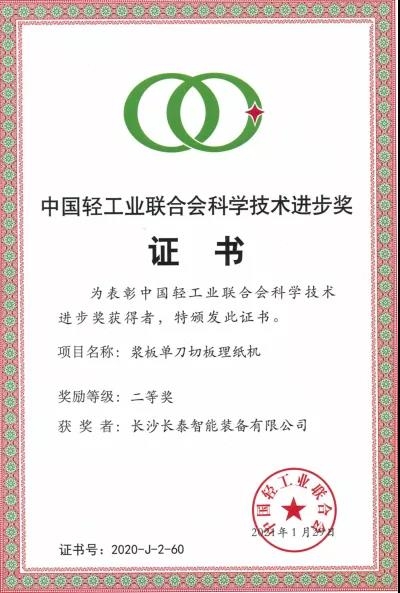 中國輕工業(yè)聯(lián)合會科學(xué)技術(shù)進步獎是由中國輕工業(yè)聯(lián)合會設(shè)立的最高輕工科技獎項,屬于國家部級科技獎勵,被認為是輕工業(yè)的“榮譽勛章”。長泰公司漿板單刀切板理紙機榮獲中國輕工業(yè)聯(lián)合會科學(xué)技術(shù)進步獎二等獎,充分體現(xiàn)了中國輕工業(yè)聯(lián)合會以及社會各界對該產(chǎn)品技術(shù)創(chuàng)新的認可。