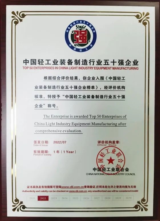 中國(guó)輕工裝備制造行業(yè)強(qiáng)企排行評(píng)價(jià)榜單始于2017年,是中國(guó)輕工業(yè)聯(lián)合會(huì)貫徹國(guó)家加強(qiáng)科技創(chuàng)新、培育具有全球競(jìng)爭(zhēng)力一流企業(yè),建設(shè)制造強(qiáng)國(guó)系列戰(zhàn)略部署的重要舉措。中國(guó)輕工業(yè)聯(lián)合會(huì)對(duì)企業(yè)的營(yíng)業(yè)收入、利潤(rùn)總額、主營(yíng)業(yè)務(wù)收入利潤(rùn)率、主營(yíng)業(yè)務(wù)收入增速、研發(fā)投入、專利數(shù)量、自主品牌建設(shè)、主要客戶群體八項(xiàng)指標(biāo)綜合評(píng)分,按統(tǒng)一標(biāo)準(zhǔn)體系進(jìn)行評(píng)價(jià)。排行評(píng)價(jià)榜單實(shí)行動(dòng)態(tài)管理,每年發(fā)布一次,科學(xué)公正,權(quán)威性高,充分展現(xiàn)企業(yè)綜合實(shí)力、品牌價(jià)值。中輕長(zhǎng)泰在輕工行業(yè)深耕23年,一直致力于為客戶提供整體解決方案,致力于輕工行業(yè)“五基”先進(jìn)基礎(chǔ)工藝綠色研究,走“專特優(yōu)精”發(fā)展道路,引領(lǐng)行業(yè)發(fā)展。