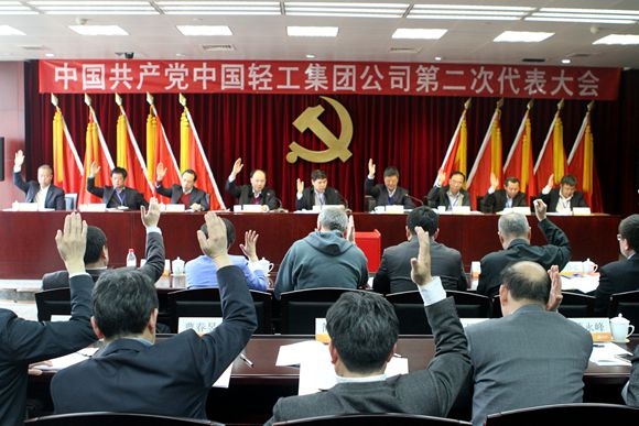 代表們舉手表決通過(guò)大會(huì)《中國(guó)共產(chǎn)黨中國(guó)輕工集團(tuán)公司第二次代表大會(huì)選舉辦法》