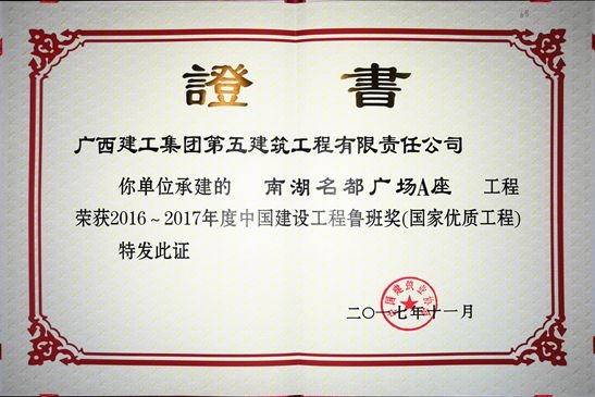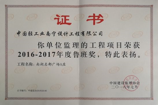 近日,海誠股份南寧公司監(jiān)理的工程項(xiàng)目—南湖名都廣場榮獲中國建設(shè)監(jiān)理協(xié)會授予“2016-2017年度魯班獎”。魯班獎是中國建筑行業(yè)工程質(zhì)量最高榮譽(yù)獎,這是公司繼廣西壯族自治區(qū)人民檢察院業(yè)務(wù)技術(shù)偵查綜合樓(2005年獲魯班獎)、廣西南寧市國土交易綜合樓(2011年獲魯班獎)后,再次獲此殊榮,具有里程碑的意義。