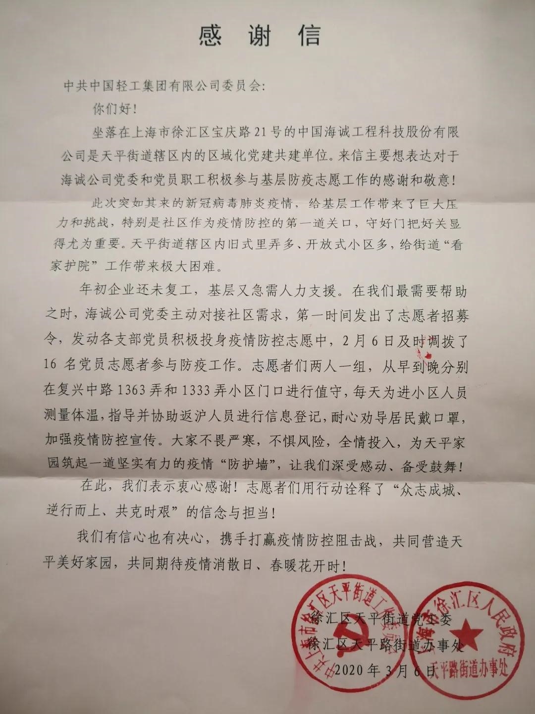 近日,一封特殊的感謝信從上海寄到了中輕集團(tuán)黨委——感謝信來(lái)自上海市徐匯區(qū)天平街道,對(duì)海誠(chéng)股份黨委和黨員職工積極參與基層防疫支援工作表示感謝和敬意。