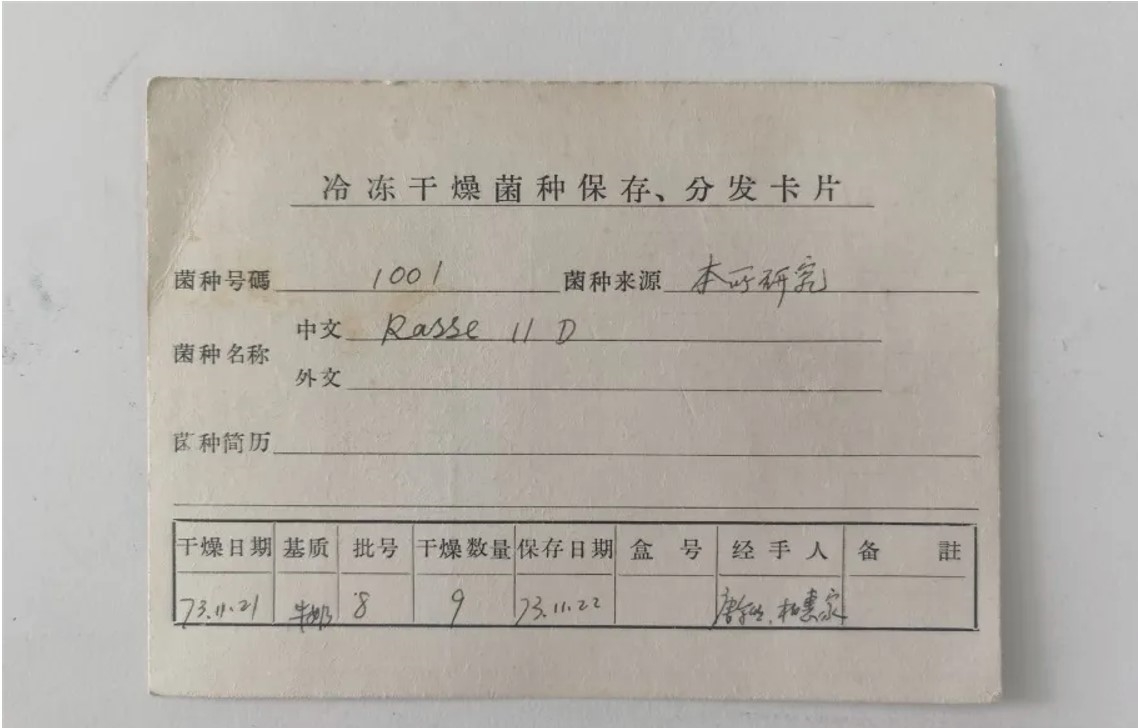 1973年制備的釀酒酵母1001的凍干管保藏卡片