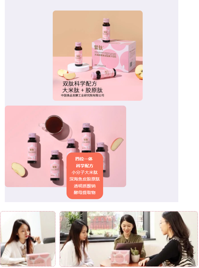 “皙肽”系列產(chǎn)品由保利中輕所屬中國食品研究院自主研發(fā)生產(chǎn),大米膠原復(fù)合肽果汁飲料以大米肽和自有專利提取的深海魚皮膠原肽為核心原料,雙肽科學(xué)配方,解決肌膚暗沉、干燥粗糙、彈性降低等肌膚問題,經(jīng)過專業(yè)檢測(cè)認(rèn)證,安全放心;中國食品研究院專家團(tuán)隊(duì)匠心研發(fā),經(jīng)過長期追蹤試飲反饋,肌膚問題明顯改善。