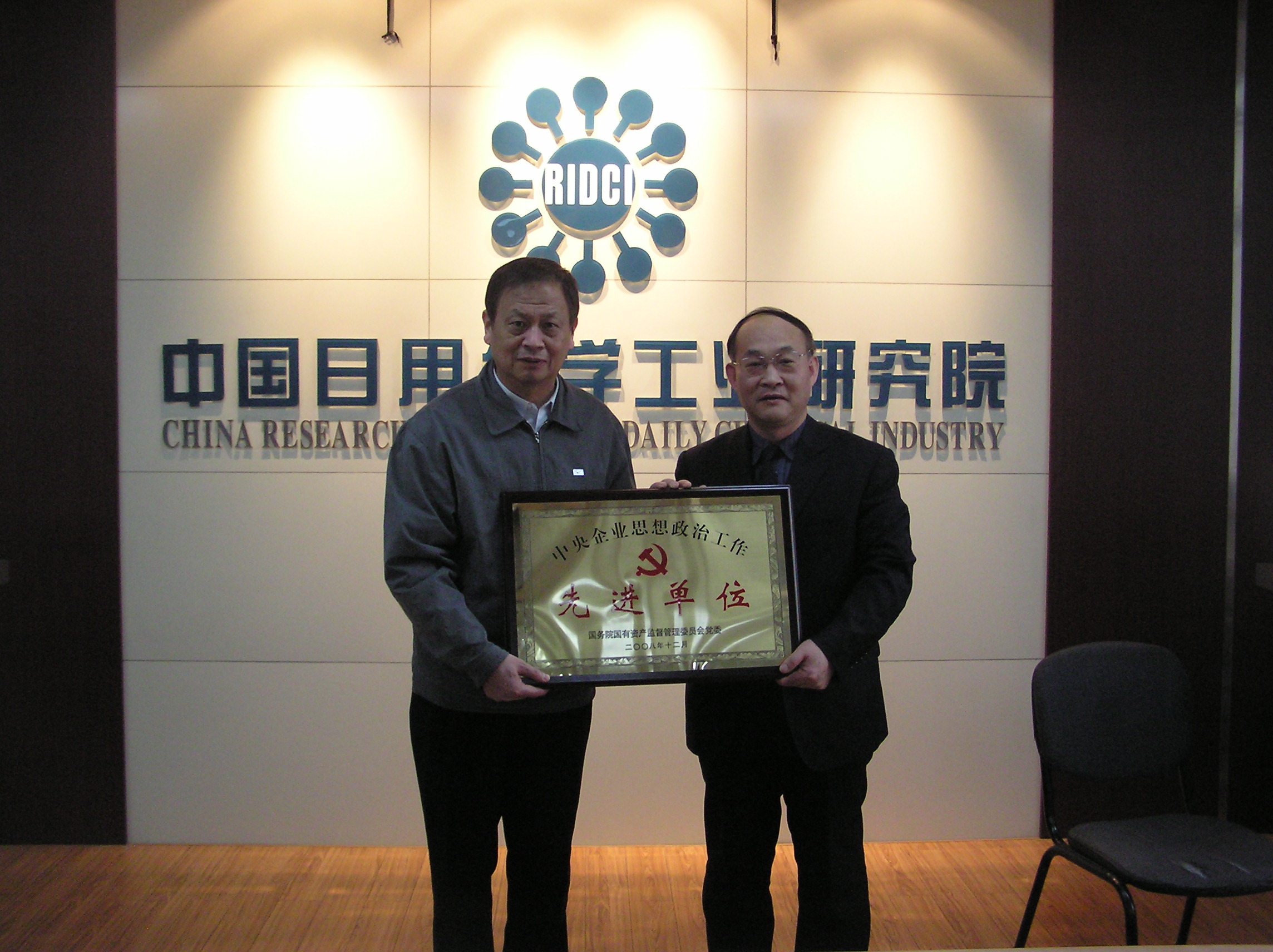 2009年,中國日用化學(xué)工業(yè)研究院榮獲國務(wù)院國資委委表彰的中央企業(yè)思想政治工作先進單位。2010年2月24日,集團公司黨委副書記、紀(jì)委書記梁江東同志到中國日用化學(xué)工業(yè)研究院開展工作,代表集團公司黨委給中國日用化學(xué)工業(yè)研究院頒發(fā)了中央企業(yè)思想政治工作先進單位獎牌。