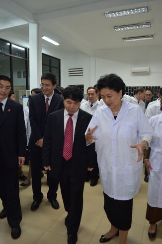 陳鄂生董事長(zhǎng)陪同國(guó)務(wù)委員劉延?xùn)|(中)、柬埔寨副首相梅森安(右一)參觀實(shí)驗(yàn)室(一)