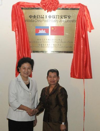 2012年12月7日,國(guó)務(wù)委員劉延?xùn)|與柬埔寨王國(guó)副首相梅森安在柬埔寨首都金邊共同為“中柬食品工業(yè)聯(lián)合實(shí)驗(yàn)室”揭牌。教育部部長(zhǎng)袁貴仁、科技部黨組書記王志剛、國(guó)務(wù)院副秘書長(zhǎng)江小涓、外交部副部長(zhǎng)宋濤及柬埔寨國(guó)務(wù)委員會(huì)、工業(yè)礦產(chǎn)及能源部、教育部、外交部等部門高級(jí)官員出席揭牌儀式。集團(tuán)公司陳鄂生董事長(zhǎng)出席儀式并陪同兩國(guó)領(lǐng)導(dǎo)人參觀了實(shí)驗(yàn)室。集團(tuán)公司所屬中國(guó)食品發(fā)酵工業(yè)研究院院長(zhǎng)蔡木易、中國(guó)海誠股份南寧公司董事長(zhǎng)王毅軍等中柬雙方項(xiàng)目執(zhí)行人員參加了典禮。