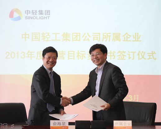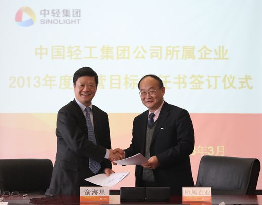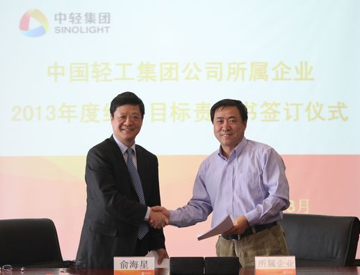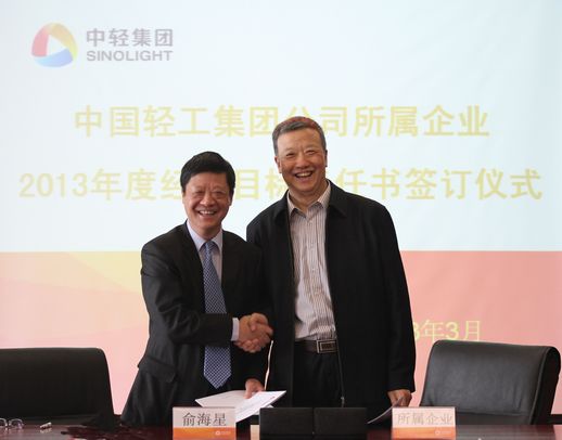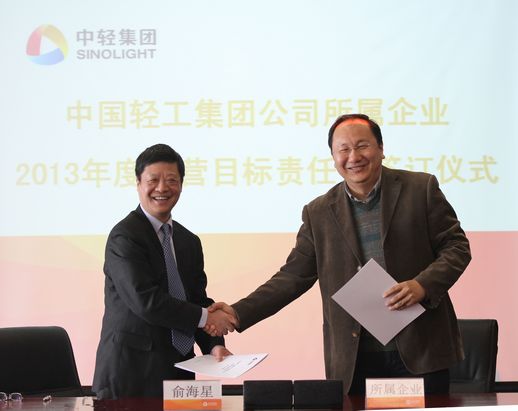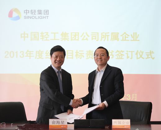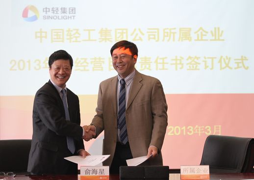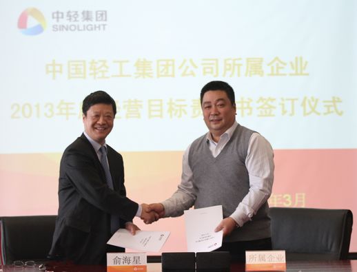 俞海星總經(jīng)理與中輕對(duì)外公司總經(jīng)理王向陽簽訂目標(biāo)責(zé)任書