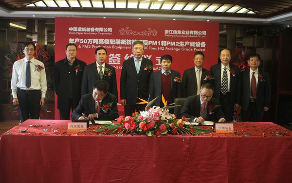 隨后,中國造紙裝備有限公司總經(jīng)理周后煉先生和浙江永泰紙業(yè)集團(tuán)生產(chǎn)總監(jiān)、浙江傳承實(shí)業(yè)有限公司董事陳獻(xiàn)忠先生代表合作雙方在合同文本上簽字。